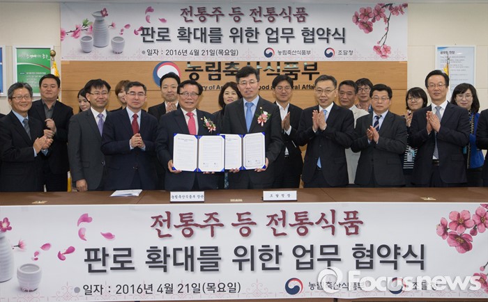 (세종=포커스뉴스) 이동필 농림축산식품부장관이 정양호 조달청장과 21일 오전 세종시 종부세종청사 농식품부 대회의실에서 나라장터 종합쇼핑몰의 전통주 판매 활성화를 지원하기 위한 업무협약을 체결하고 기념촬영 하고 있다.