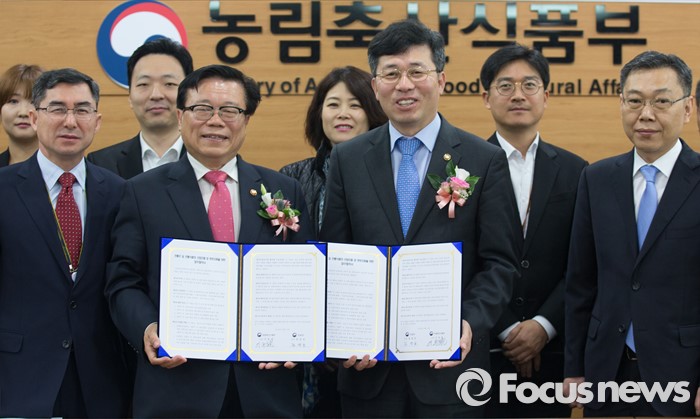 (세종=포커스뉴스) 이동필 농림축산식품부장관이 정양호 조달청장과 21일 오전 세종시 종부세종청사 농식품부 대회의실에서 나라장터 종합쇼핑몰의 전통주 판매 활성화를 지원하기 위한 업무협약을 체결하고 기념촬영 하고 있다.