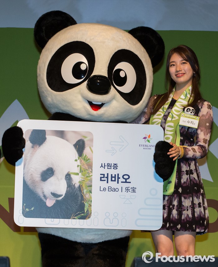 (용인=포커스뉴스) 21일 오전 경기도 용인시 에버랜드에서 열린 '판다월드 개관식'에서 미쓰에이 수지가 러바오 팬더 캐릭터 인형과 기념촬영을 하고 있다.