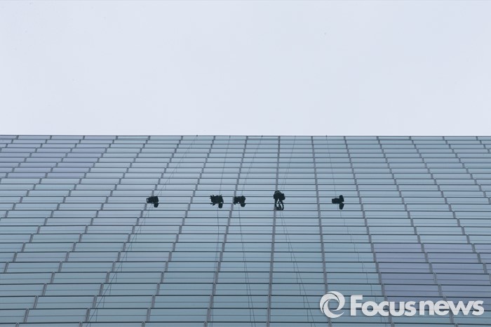 (서울=포커스뉴스) 비가 내린 21일 오전 서울 여의도 전경련회관에서 청소업체 관계자들이 회관 외벽 청소를 하고 있다.