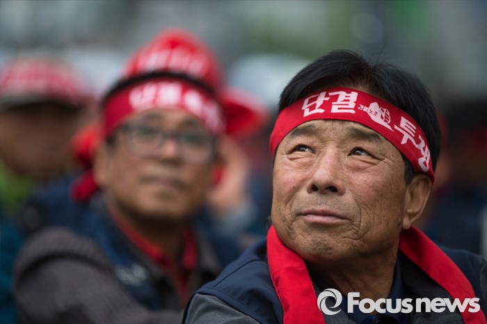 (서울=포커스뉴스) 21일 오후 서울역 앞에서 민주노총 전국건설노동조합 전국의 간부들이 건설노조 확대간부 결의대회를 열고 건설민생법안 통과를 촉구하는 집회를 하고 있다.