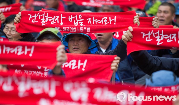 (서울=포커스뉴스) 21일 오후 서울역 앞에서 민주노총 전국건설노동조합 전국의 간부들이 건설노조 확대간부 결의대회를 열고 건설민생법안 통과를 촉구하는 집회를 하고 있다.