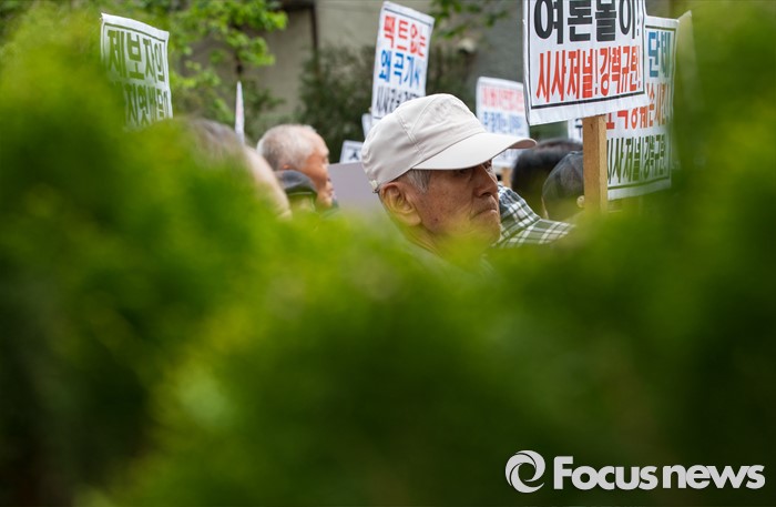 (서울=포커스뉴스) 최근 전경련의 차명계좌 자금 지원 의혹을 받고 있는 어버이연합 회원들이 21일 오후 서울 용산구 시사저널 사옥 앞에서 시사저널 규탄 기자회견을 하고 있다.