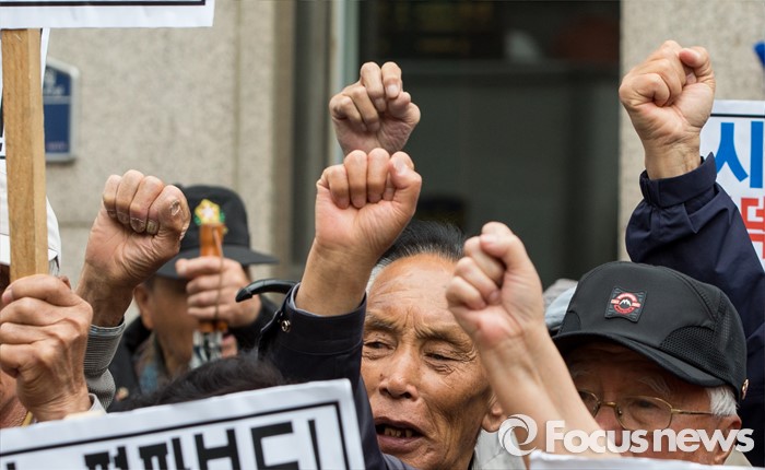 (서울=포커스뉴스) 최근 전경련의 차명계좌 자금 지원 의혹을 받고 있는 어버이연합 회원들이 21일 오후 서울 용산구 시사저널 사옥 앞에서 시사저널 규탄 기자회견을 하고 있다.
