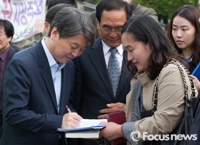 (청주=포커스뉴스) 안철수 국민의당 상임공동대표가 21일 오후 충북 청주 상당구 성안길을 찾아 지지자들에게 싸인을 하고 있다. 안 대표는 4.13 국회의원선거에서 국민의당을 지지해준 것에 대한 감사의 뜻을 전했다.