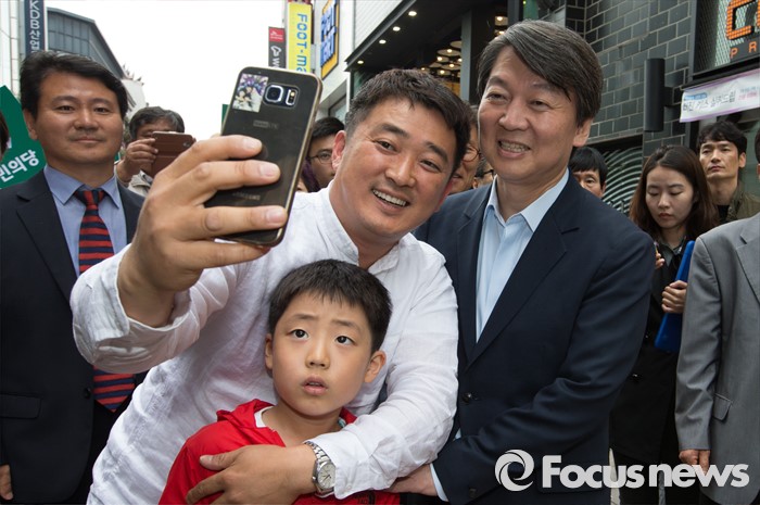 (청주=포커스뉴스) 안철수 국민의당 상임공동대표가 21일 오후 충북 청주 상당구 성안길을 찾아 시민들과 셀카를 촬영하고 있다. 안 대표는 4.13 국회의원선거에서 국민의당을 지지해준 것에 대한 감사의 뜻을 전했다.