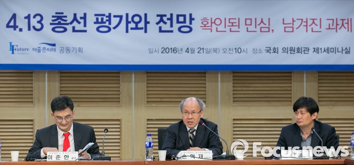 경제적 측면과 관련해선 "과거 분배만 강조했다면 성장 담론을 좀 더 (보완해야 한다)"면서 "김종인 대표가 계속 전면적 복지를 이야기했는데 다음 선거를 두고는 조금 보완할 필요가 있다"고 주장했다.21일 오전 서울 여의도 국회 의원회관에서 더미래연구소와 더좋은미래 모임 공동주최로 열린 4·13 총선 평가와 전망 확인된 민심, 남겨진 과제 토론회에 참석한 손혁재 경기대학교 정치전문대학원 초빙교수가 발언하고 있다. 왼쪽부터 이준한 인천대학교 정치외교학과 교수, 손 교수, 정한울 고려대학교 평화와 민주주의연구소 연구교수. 2016.04.21 박동욱 기자 (서울=포커스뉴스) 21일 오전 서울 여의도 국회 의원회관에서 더미래연구소와 더좋은미래 모임 공동주최로 열린 4·13 총선 평가와 전망 확인된 민심, 남겨진 과제 토론회에 참석한 이철희(오른쪽부터) 더불어민주당 전략기획위원장, 우상호, 남인순, 변재일 의원이 토론자들의 발언을 듣고 있다. 2016.04.21 박동욱 기자