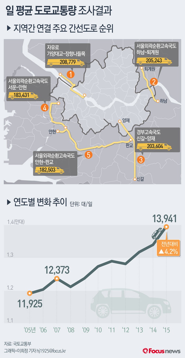 (서울=포커스뉴스) 21일 국토교통부가 발표한 ‘2015년도 도로교통량 조사결과’에 따르면 간선도로 교통량은 전년비 4.2% 늘어난 1만3941대를 기록했다. 주요 지역간 연결 간선도로 중 교통량이 가장 많은 구간은 자유로 가양대교~장항나들목으로 나타났다.