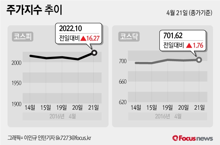 (서울=포커스뉴스) 21일 코스피지수는 전날 보다 0.81%(16.27포인트) 오른 2022.10에 장을 마쳤다. 코스닥지수는 전일 대비 0.25%(1.76포인트) 오른 701.62에 마감했다.
