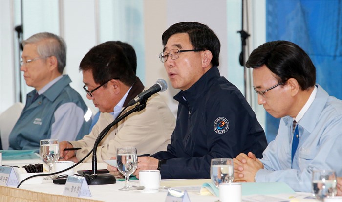 (서울=포커스뉴스) 이기권 고용노동부장관이 21일 오전 서울 송차구 잠실 제2롯제월드 120층 신축공사 건물에서 50대 건설업체 CEO가 참석하는 건설업 안전보건리더 회의를 주재하고 있다. <사진제공=고용노동부>