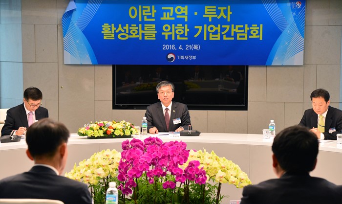 (서울=포커스뉴스) 최상목 기획재정부 차관이 21일 서울시 중구 우리은행 본사에 위치한 이란교역투자지원센터를 현장을 방문해, 간담회를 갖고 모두발언을 하고 있다. <사진제공=기획재정부>