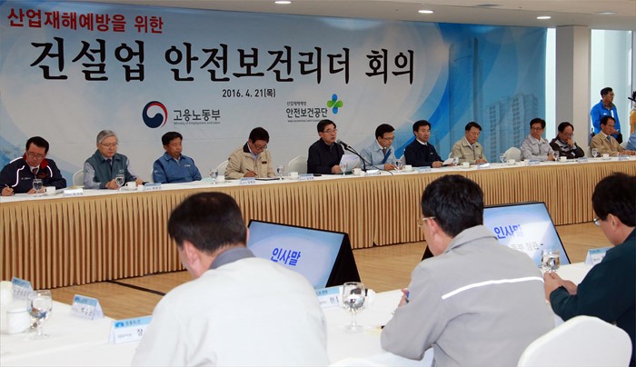 (서울=포커스뉴스) 이기권 고용노동부장관이 21일 오전 서울 송차구 잠실 제2롯제월드 120층 신축공사 건물에서 50대 건설업체 CEO가 참석하는 건설업 안전보건리더 회의를 주재하고 있다. <사진제공=고용노동부>