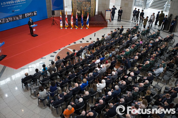 (서울=포커스뉴스) 21일 오후 서울 용산구 전쟁기념관에서 열린 6.25 전쟁영웅 선정패 수여식에서 박승춘 국가보훈처장이 인사말을 하고 있다.
