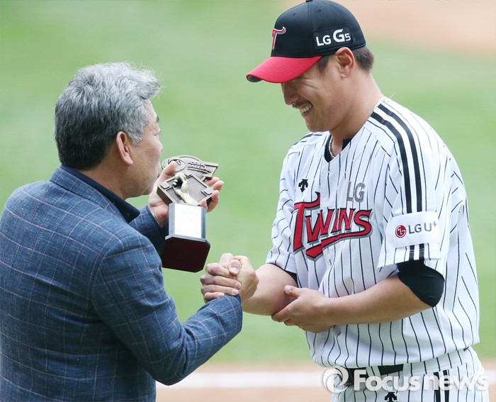 (서울=포커스뉴스) 21일 서울 잠실구장에서 열린 2016 프로야구 NC-LG 경기에 앞서 LG 투수 이동현이 프로통산 100홀드 달성 기념패를 조종규 KBO 경기감독관에게서 수상하고 있다.