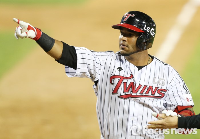 (서울=포커스뉴스) 21일 서울 잠실구장에서 열린 2016 프로야구 NC-LG 경기 4회말 LG 히메네스가 서상우의 홈런에 이어 좌월 1점홈런을 치고 중앙 관중석을 가리키며 홈인하고 있다.