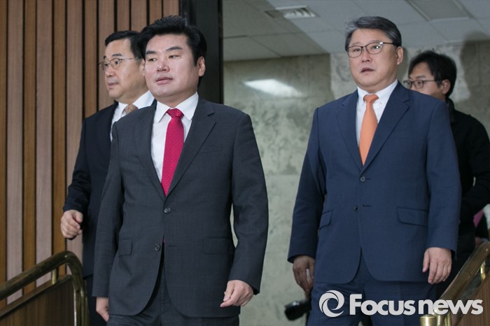 (서울=포커스뉴스) 원유철(가운데) 새누리당 원내대표와 김정훈(왼쪽) 정책위의장, 조원진 원내수석부대표가 22일 오전 서울 여의도 국회에서 열린 원내대책회의에 참석하고 있다.