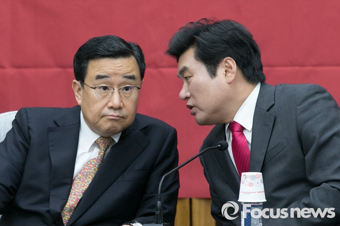 (서울=포커스뉴스) 원유철(오른쪽) 새누리당 원내대표와 김정훈 정책위의장이 22일 오전 서울 여의도 국회에서 열린 원내대책회의에 참석해, 대화하고 있다.