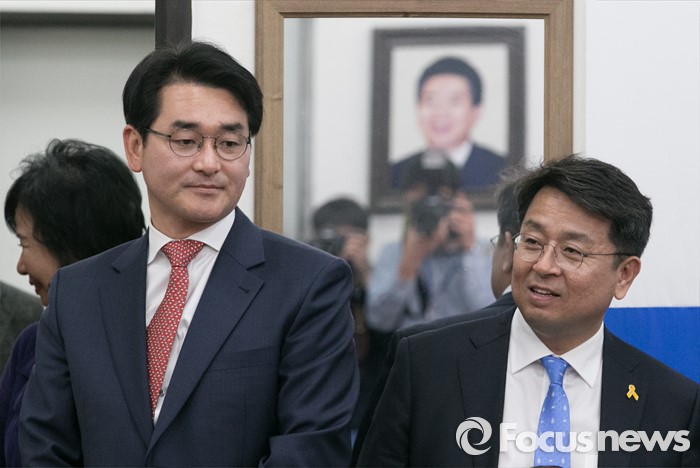 (서울=포커스뉴스) 박용진(왼쪽) 더불어민주당 대표비서실장과 이철희 전략기획위원장이22일 오전 서울 여의도 국회에서 열린 비상대책위원회의에 참석해 대화하고 있다.