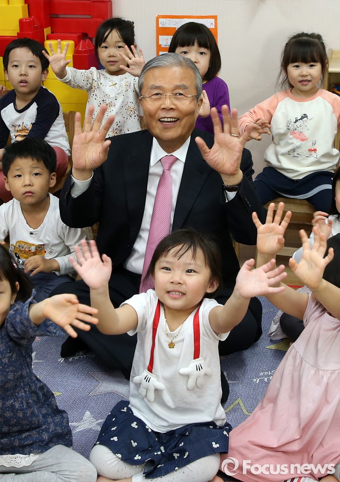 (서울=포커스뉴스) 김종인 더불어민주당 비대위 대표가 22일 오전 서울 여의도 국회 제3어린이집을 방문해, 어린이들과 기념사진을 찍고 있다.