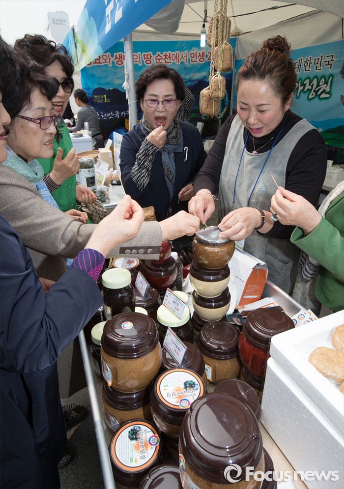 (서울=포커스뉴스) 22일 오전 서울 광화문 광장에서 열린 '2016 광주·전남 귀농귀촌 박람회' 순천시 부스에서 참석자들이 된장, 고추장을 비롯한 다양한 상품들을 시식하고 있다.