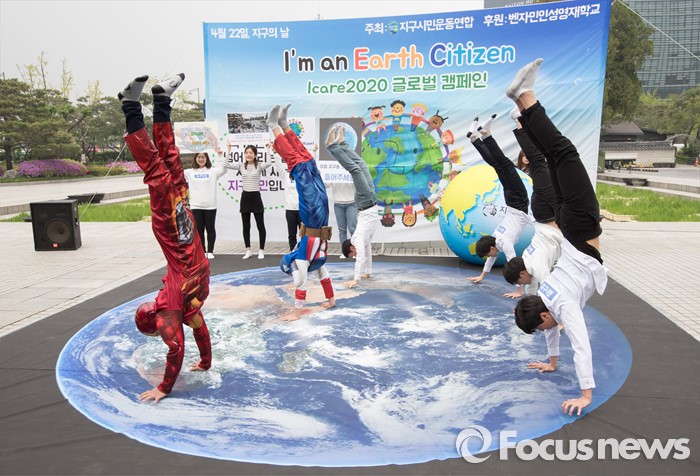(서울=포커스뉴스) 22일 서울 종로구 광화문시민열린마당에서 지구시민운동연합 회원들이 제46회 지구의 날을 기념해 '나는 지구시민입니다'라는 주제로 플래시몹을 하고 있다.