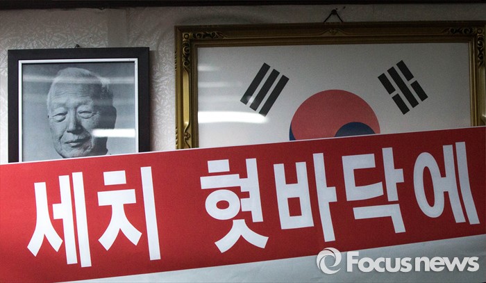 (서울=포커스뉴스) 전경련에서 자금지원을 받은 의혹으로 논란에 휩싸인 어버이연합이 22일 오전 서울 종로구에 위치한 어버이연합 사무실에서 기자회견을 시작하기 전 이승만 전 대통령 사진 앞으로 기자회견에 쓰일 플래카드를 설치하고 있다.