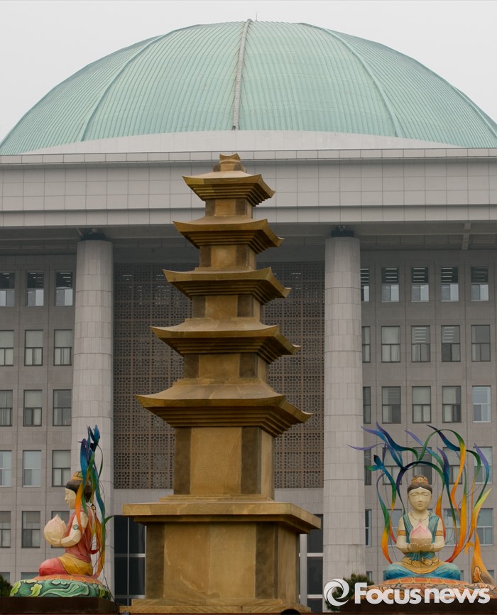 (서울=포커스뉴스) 석가탄신일을 3주 가량 앞둔 22일 오후 서울 여의도 국회 본청 앞 분수광장에 연등이 설치되어 있다.