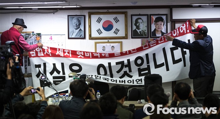 (서울=포커스뉴스) 전경련에서 자금지원을 받은 의혹으로 논란에 휩싸인 어버이연합이 22일 오전 서울 종로구에 위치한 어버이연합 사무실에서 기자회견을 시작하기 전 플래카드를 설치하고 있다.