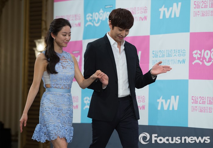 (서울=포커스뉴스) 22일 오후 서울 강남구 임피리얼 팰리스호텔에서 열린 tvN 월화드라마 '또! 오해영' 제작발표회에 참석한 배우 전혜빈(왼쪽)과 에릭이 포토타임을 위해 이동하고 있다.