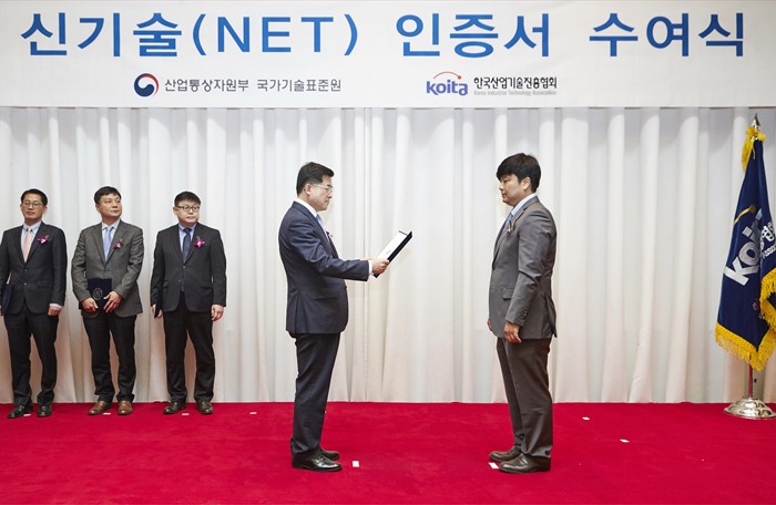 (서울=포커스뉴스) 제대식 산업통상자원부 국가기술표준원장이 22일 오전 서울 벨레상스 서울호텔 다이아몬드홀에서 열린 2016년도 제1회 신기술인증(NET) 수여식에 참석해, 인증서를 수여하고 있다.