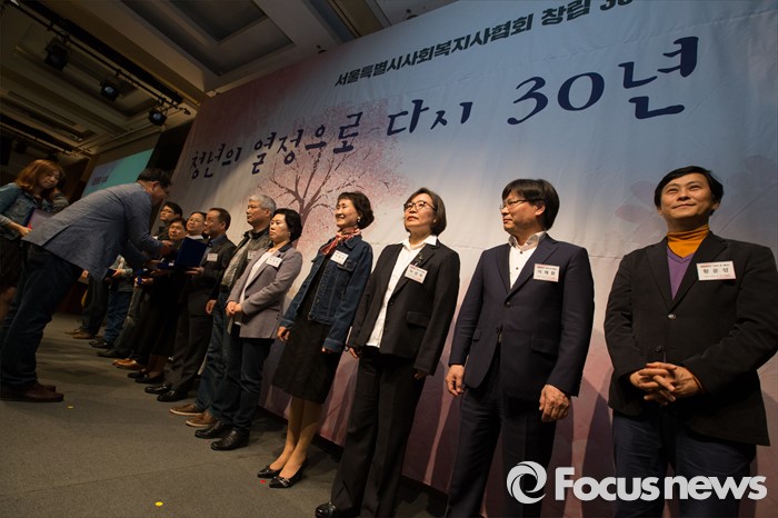 (서울=포커스뉴스) 22일 오후 서울 용산구 백범기념관에서 열린 사회복지사협의회 창립 30주년 기념행사에서 장재구 사회복지사협회 회장이 공로패를 사회복지사들에게 전달하고 있다.