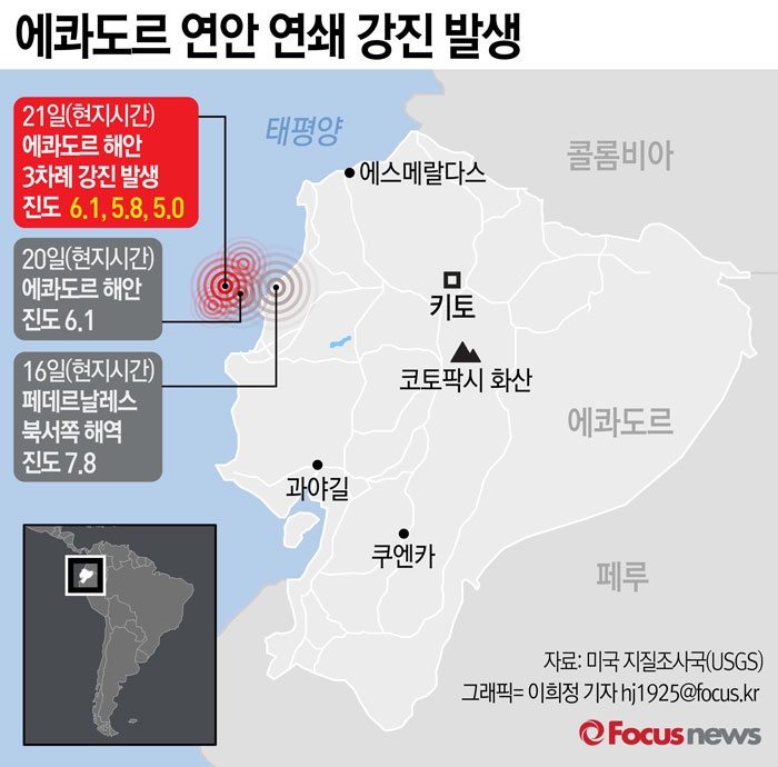 (서울=포커스뉴스) 미국 지질조사국(USGS)에 따르면 21일(현지시간) 에콰도르 해안에 진도 6.0 안팎의 강진이 연쇄적으로 세 차례 발생했다.