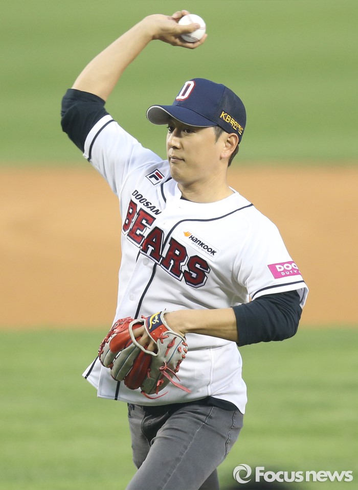 (서울=포커스뉴스) 22일 서울 잠실구장에서 열린 2016 프로야구 한화-두산 경기에 앞서 인기 아나운서 한석준이 시구하고 있다.