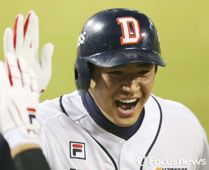 (서울=포커스뉴스) 22일 서울 잠실구장에서 열린 2016 프로야구 한화-두산 경기 7회말 1사 만루에서 두산 에반스의 대타로 나온 김재환이 한화 투수 이재우의 초구에 우월 만루 홈런을 치고 홈인하며 환호하고 있다.