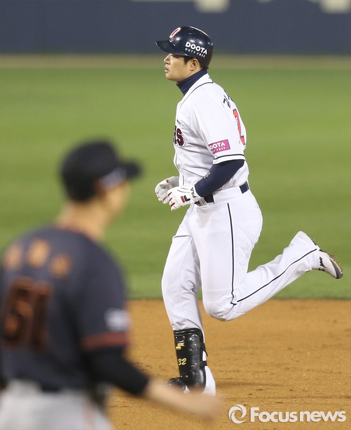 (서울=포커스뉴스) 22일 서울 잠실구장에서 열린 2016 프로야구 한화-두산 경기 7회말 1사후 두산 에반스의 대타로 나온 김재환이 한화 투수 이재우의 초구에 우월 만루 홈런을 치고 베이스를 돌고 있다.