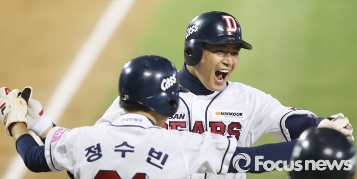 (서울=포커스뉴스) 22일 서울 잠실구장에서 열린 2016 프로야구 한화-두산 경기 7회말 1사후 두산 에반스의 대타로 나온 김재환이 한화 투수 이재우의 초구에 우월 만루 홈런을 치고 홈인하며 환호하고 있다.