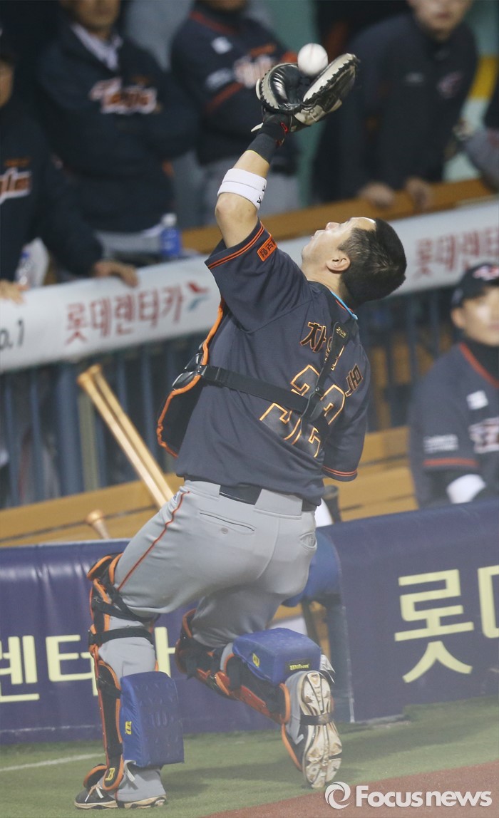 (서울=포커스뉴스) 22일 서울 잠실구장에서 열린 2016 프로야구 한화-두산 경기 6회말 2사 1,3루에서 한화 포수 차일목이 두산 양의지의 파울 플라이볼을 덕아웃 앞에서 잡고 있다.