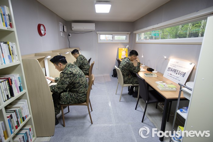 (서울=포커스뉴스) 세계 책의 날을 하루 앞둔 22일 오후 서울 중구 태평로 청계광장에서 열린 2016 세계 책의 날 기념 '두근두근 책 속으로' 책드림 날 행사에 참가한 군인들이 병영독서카페 부스에서 독서를 하고 있다.