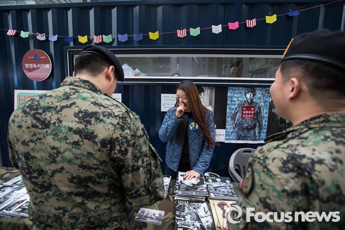 (서울=포커스뉴스) 세계 책의 날을 하루 앞둔 22일 오후 서울 중구 태평로 청계광장에서 열린 2016 세계 책의 날 기념 '두근두근 책 속으로' 책드림 날 행사에 참가한 군인들이 병영독서카페 부스에서 책을 고르고 있다.