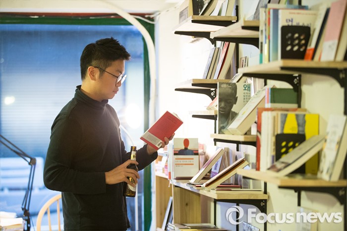 (서울=포커스뉴스) 세계 책의 날을 하루 앞둔 22일 오후 서울 마포구 이대역 인근의 독립 책방 '퇴근길 책한잔' 운영자가 맥주를 마시며 책을 읽고 있다. 이 책방은 책과 함께 술을 마실 수 있는 이색적인 장소로 유명하다.