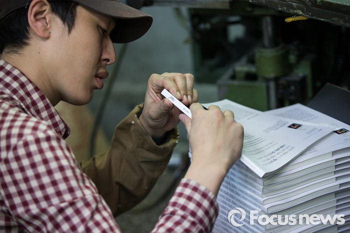 (서울=포커스뉴스) 세계 책의 날을 하루 앞둔 22일 오후 서울 중구 충무로의 한 인쇄소에서 직원이 책 표지를 입히고 있다.