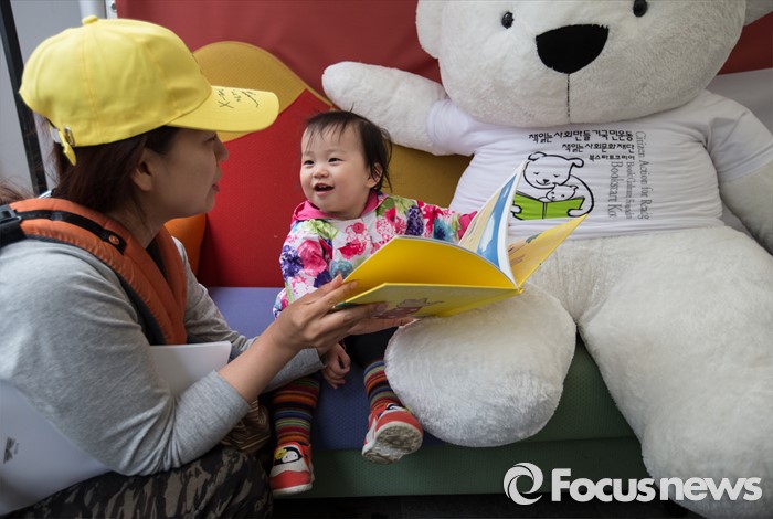 (서울=포커스뉴스) 세계 책의 날을 하루 앞둔 22일 오후 서울 중구 태평로 청계광장에서 열린 2016 세계 책의 날 기념 '두근두근 책 속으로' 책드림 날 행사에서 한 아동이 엄마와 책을 읽고 있다.