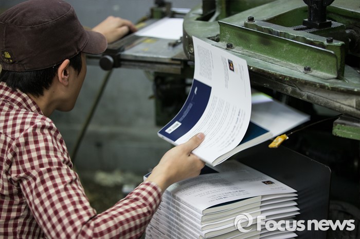 (서울=포커스뉴스) 세계 책의 날을 하루 앞둔 22일 오후 서울 중구 충무로의 한 인쇄소에서 직원이 책 표지를 입히고 있다.