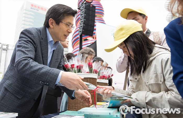 (서울=포커스뉴스)유네스코가 1995년 제정한 ‘세계 책과 저작권의 날’인 23일 오전 서울 중구 청계광장에서 열린 2016 세계 책의 날 기념 책드림 행사 '두근두근 책 속으로'에서 황교안 국무총리가 어린이들에게 책과 꽃을 선물하며 인사하고 있다.