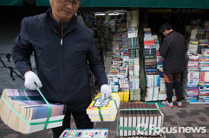 (서울=포커스뉴스) 세계 책의 날인 23일 오전 서울 중구 청계6가 평화시장 헌책방 골목에서 책방 주인들이 영업 준비를 하고 있다. 청계 6가 헌책방거리는 1970년대 점포수가 200여 개에 달할 정도로 성황이었지만 현재는 25곳 정도 밖에 남아 있지 않다.