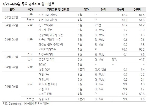 이번 주 주목할 이벤트와 경제지표는 26~27일 열리는 4월 FOMC(연방공개시장위원회) 회의다. 업계는 미국 연방준비제도이사회(FRB)이 이달 금리를 동결시킬 것으로 예상하고 있다.