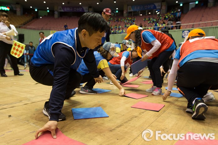 (서울=포커스뉴스) 24일 오전 서울 송파구 잠실실내체육관에서 열린 '2016 서울시민 생활체육대회' 참가자들이 판 뒤집기 게임을 즐기고 있다.