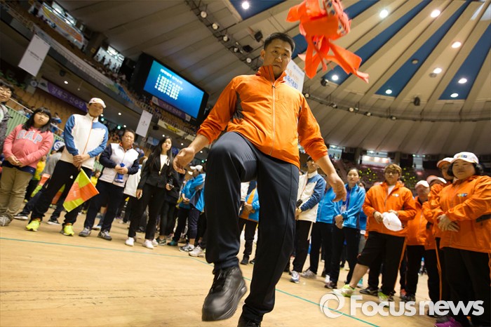 (서울=포커스뉴스) 24일 오전 서울 송파구 잠실실내체육관에서 열린 '2016 서울시민 생활체육대회' 참가자가 제기차기를 하고 있다.