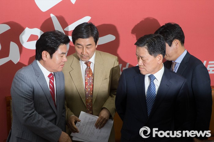 (서울=포커스뉴스) (왼쪽부터) 새누리당 원유철, 더민주 이종걸, 국민의당 주승용 원내대표가 24일 오후 서울 여의도 국회에서 열린 3당 원내대표 회담에 참석해 인사를 나누고 있다.