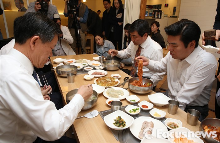 (서울=포커스뉴스) 24일 서울 여의도 한 식당에서 여,야 3당 원내대표가 화합하여 모든 정책을 잘 버무려 내겠다는 비빔냉면과 국민들에게 시원한 정치를 보여주겠다는 뜻의 물냉면을 먹는 오찬 냉면 회동을 갖고 있다.